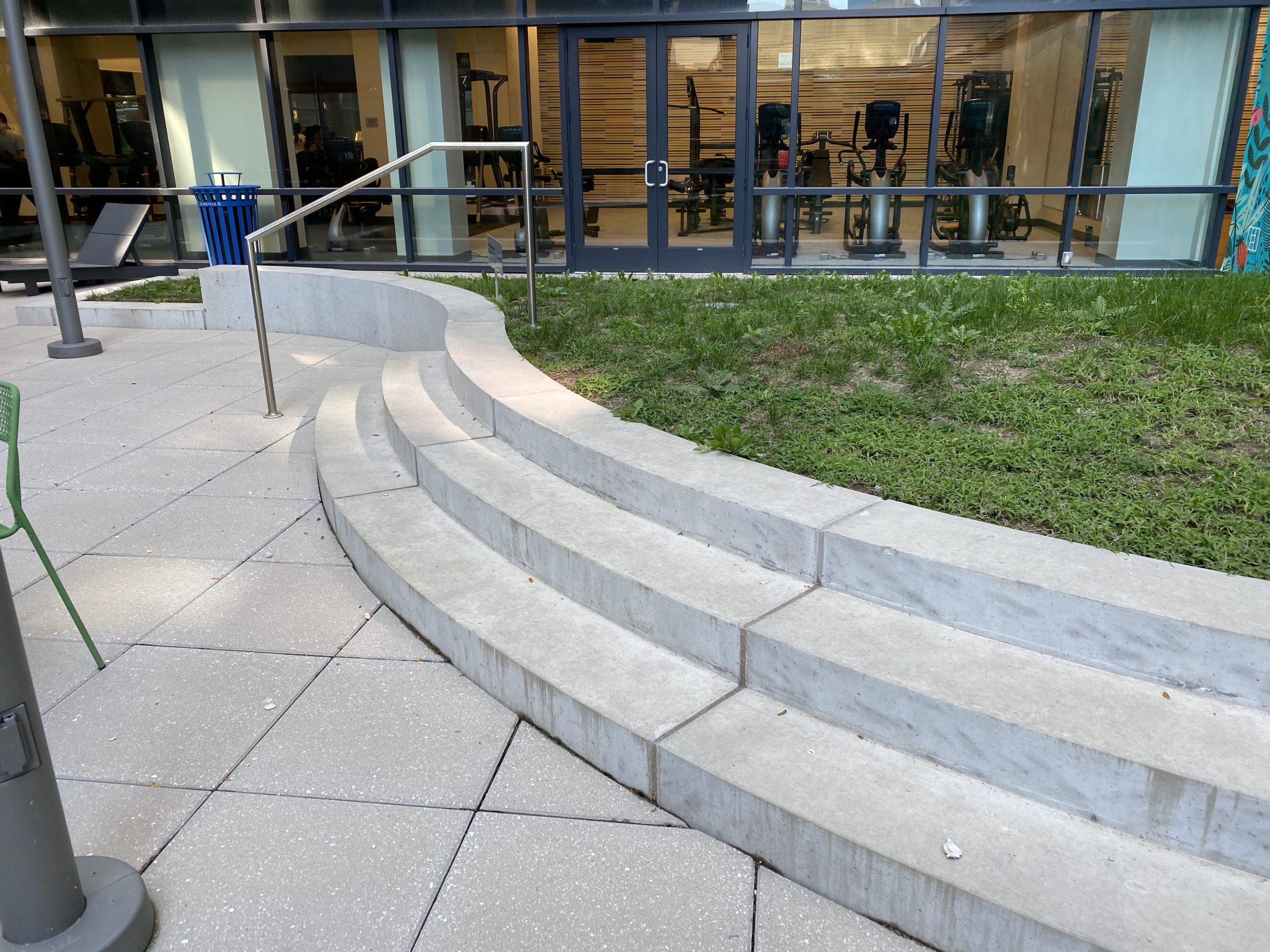 Nosing steps are designed to be installed perpendicular to the building. They feature a broom finish on the treads and bullnose return at all 90-degree corners. They can be manufactured to the combination of sizes listed below.